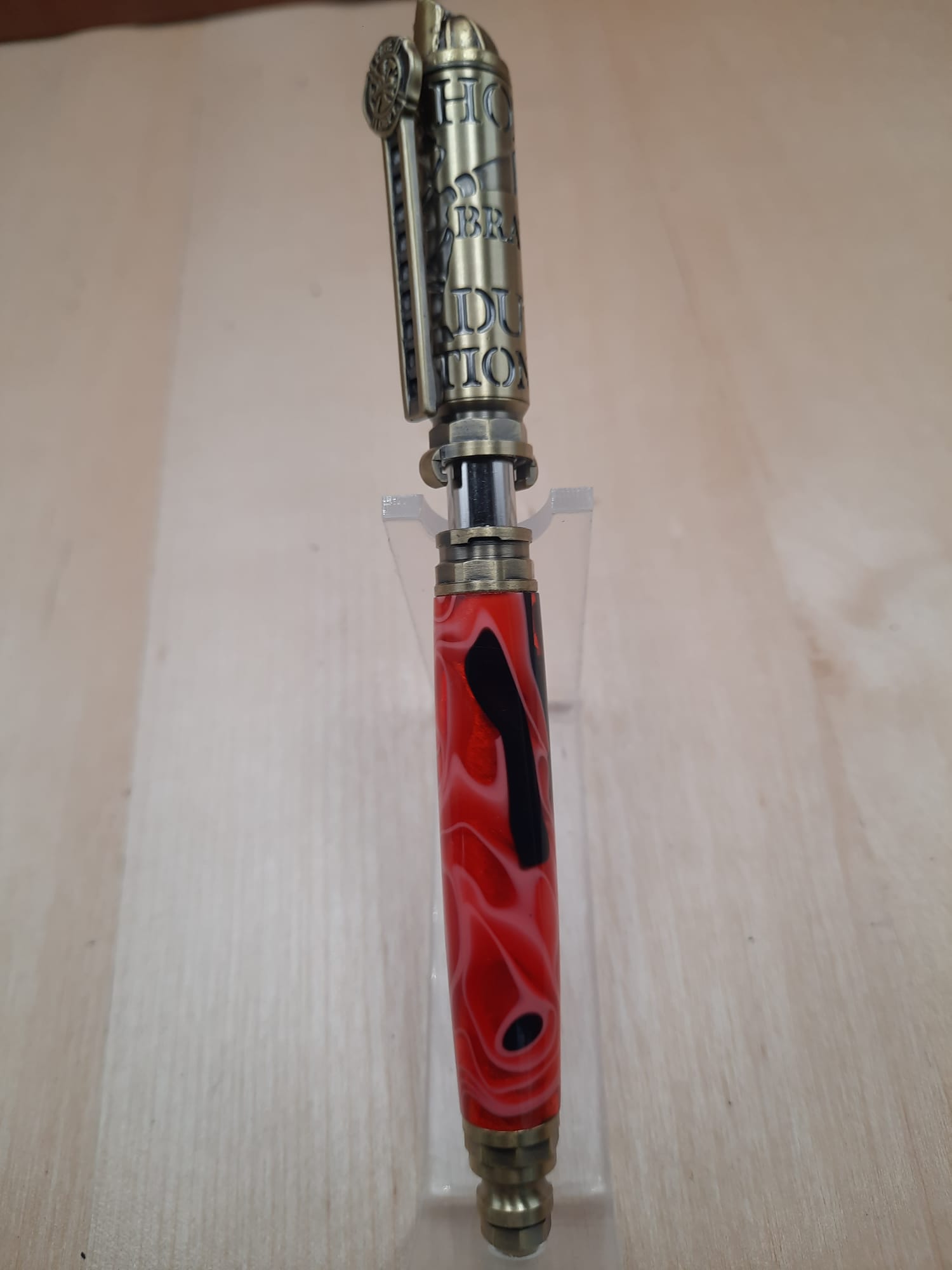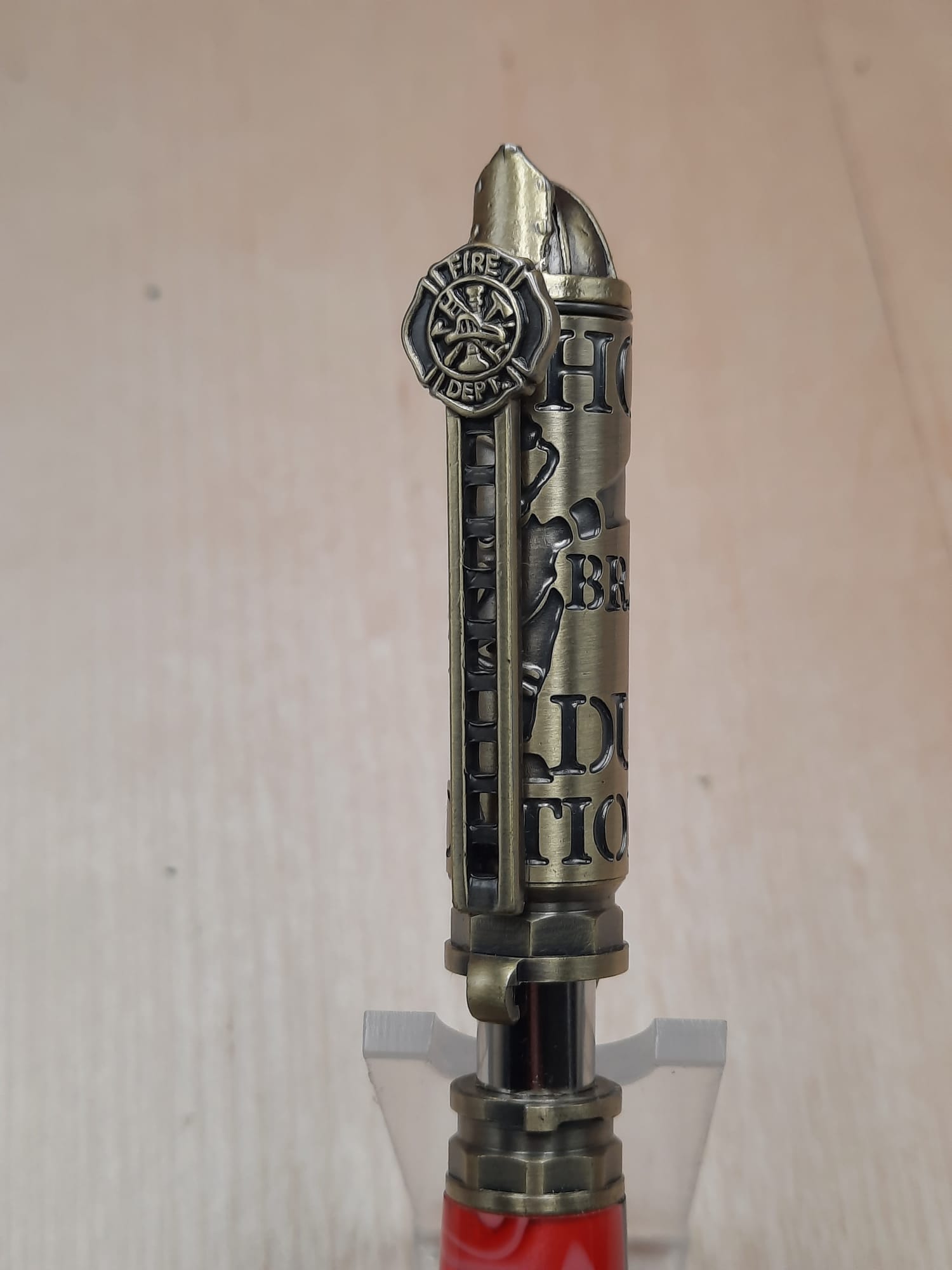 Dieser handgefertigte Kugelschreiber ist ein Muss für Feuerwehrleute, die exklusive Schreibgeräte lieben. Er besticht durch Details wie Helm, Feuerwehrleiter und Kupplung und ist aus feuerwehrrotem Acryl gefertigt. Verfügbar auch in anderen Holzarten, z.B. Thuja-Maser.